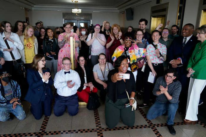 FILE – Supporters of a resolution that would make Kansas City, Mo, a sanctuary city for transgender people celebrate outside of city council chambers after a committee approved the resolution, sending it to the full council for consideration, Wednesday, May 10, 2023, in Kansas City, Mo. (AP Photo/Charlie Riedel, File)