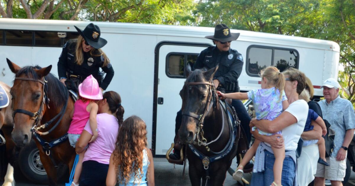 Kids take turns petting Stetson and Poncho during NBPD National Night Out event Tuesday at Bonita Canyon Park.
