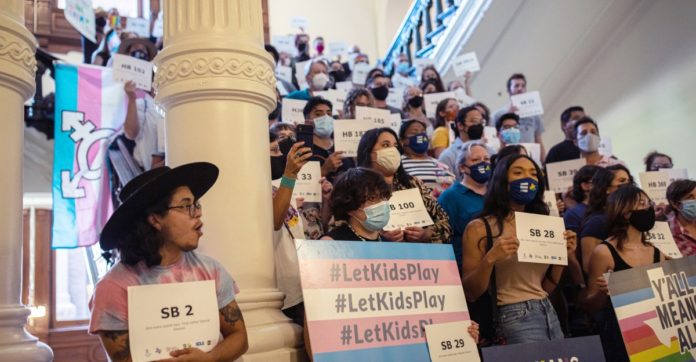 LGBTQ rights supporters gather at the Texas state Capitol to protest state Republican-led efforts to pass legislation that would restrict the participation of transgender student athletes on the first day of the 87th Legislature’s third special session on September 20, 2021 in Austin, Texas. Tamir Kalifa/Getty Images