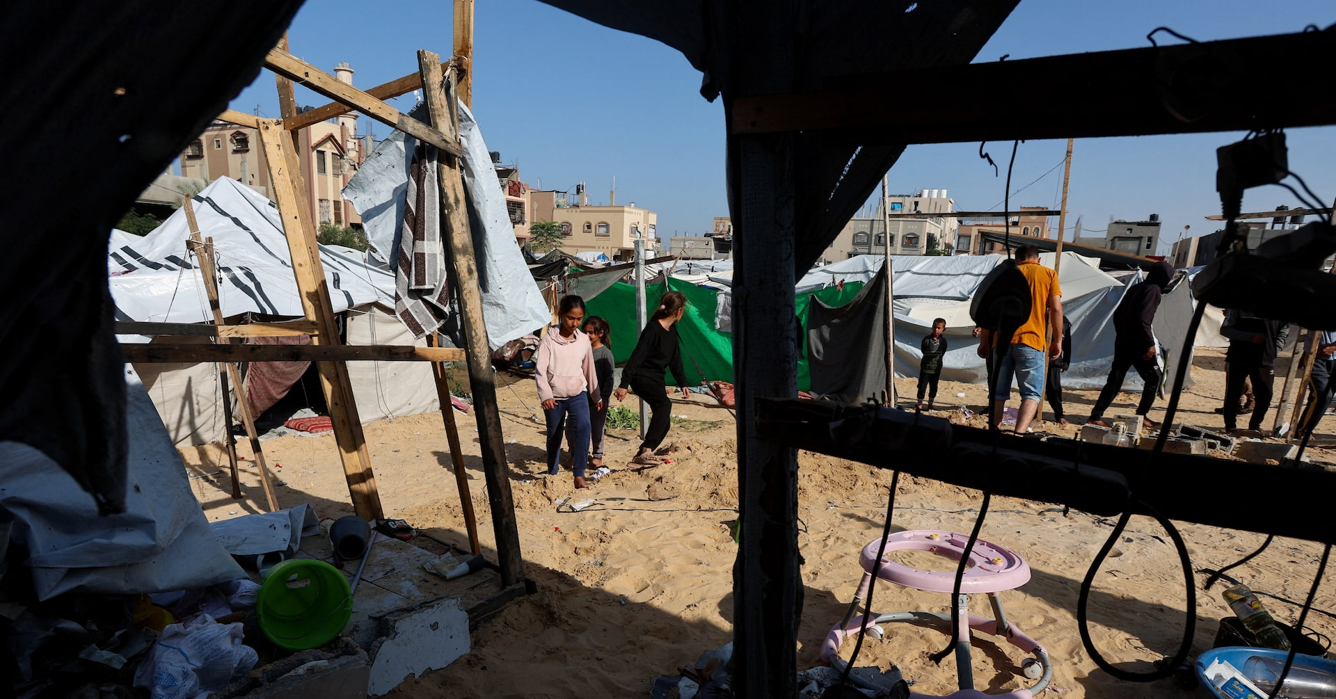 In Gaza City’s Zeitoun suburb, where at least 10 people were killed in a building that used to house displaced families on Wednesday, Palestinians sifted through the wreckage to salvage furniture and belongings as rescue workers searched for any further victims.