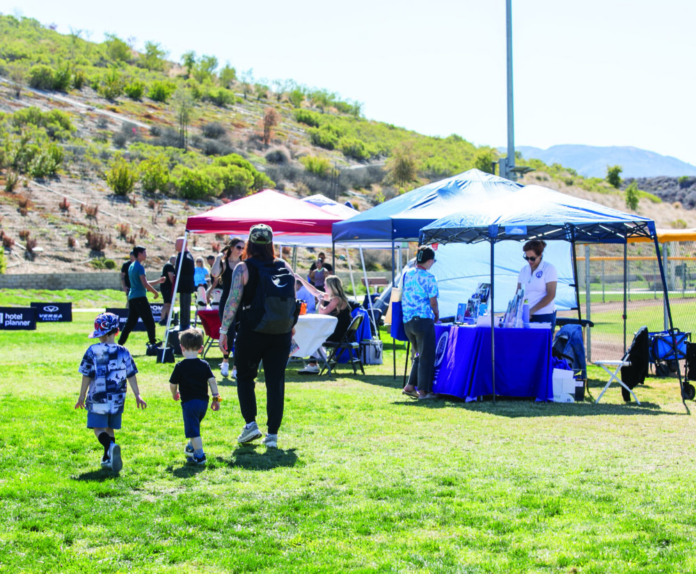 Various wellness booths, ranging from sound baths to martial arts, lined up at Plum Canyon Park recently during the inaugural JCI Santa Clarita Wellness Expo.